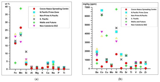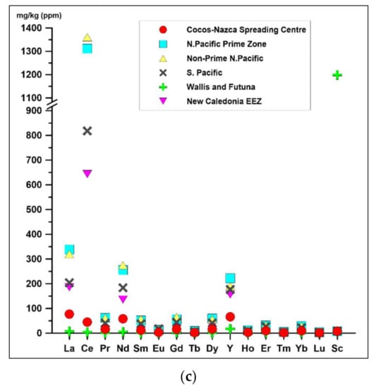 Hydrogenetic precipitation dominates in most cobalt-rich crusts, which promotes greater Co, HFSE and REY concentrations while the hydrothermal processes, due to rapid formation and high content of either Fe or Mn oxides, led to HFSE and REY depletion. Diagenetic precipitation which are connected mostly with polymetallic nodule formation in oxic or suboxic conditions characterized by different metal concentrations. The oxic conditions produce higher Mn, Cu, and Ni concentrations while suboxic promote greater Mn and Fe remobilization and incorporation of Cu and Ni ions in nodules [75]. Due to widely variable geological settings that include the plume temperature, hydrothermal Fe-Mn deposits vary considerably. Metalliferous sediments near hydrothermal fields along the mid-ocean ridges are related to high temperature venting (plume fall-out deposits). “Stratabound” crusts (cemented layered sediments) occur in locations that occur some distance from mid-ocean ridges and are more characteristic of hot spot seamounts, volcanic arcs and back-arc environments. These deposits show Mn/Fe ratios that range from 0.001 (nearly no Mn) to 4000 and low metal contents [75,78].