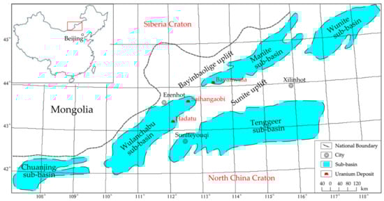 - Yan, Z.B.; Nie, F.J.; Hu, J.J.; Kang, S.H. Study on uranium occurrences of sandstone-type uranium deposit in Bayanwula area, Erlian basin, Inner Mongolia. In Progress in Environmental Protection and Processing of Resource, Pts 1–4; Trans. Tech. Publications Ltd.: Stafa-Zurich, Switzerland, 2013; Volumes 295–298, p. 2803. [Google Scholar]