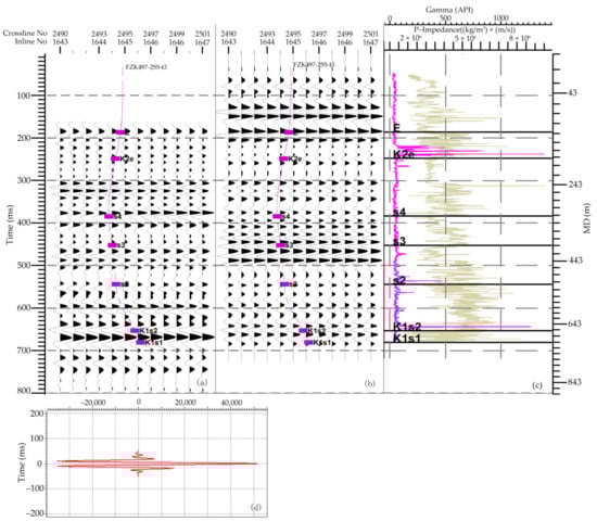 Synthetic seismic calibration of the typical borehole data from the 3D seismic study area. (a) the seismic data; (b) synthetic model calculated by the convolution of the reflection coefficient and the wavelet; (c) the gamma and impedance loggings of the typical well; (d) the wavelet extracted from well and seismic data.