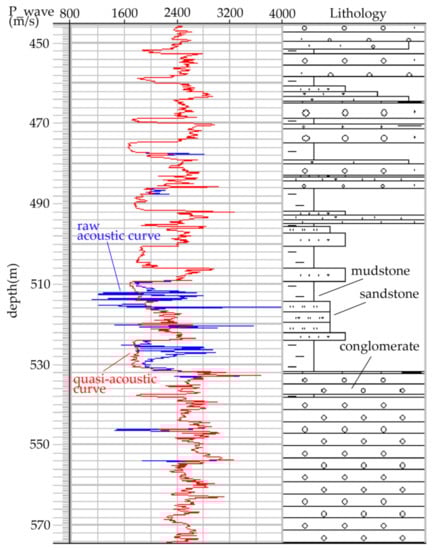 This work first focuses on synthetic seismic correlation. The typical phase is shown in Figure 3, where the purple vertical lines represent the drilling track, and the purple horizontal lines represent the bottoms of geological horizons; the impedances are calculated from the measured velocity and density. Secondly, we perform horizon interpretation based on synthetic seismic correlation, which is central to determining whether target deposits are present; meanwhile, fault interpretation is executed primarily using post-stack data, the seismic coherence attribute, and the instantaneous phase attribute. This is also very important, because these faults may be ancient channels by which reducing agents rose to sufficient depth to promote the redox reaction for U mineralization. Finally, we know that the thickness of uranium-bearing sandstone varies from several meters to dozens of meters, so determining the sandstone distribution is key in SUD seismic inversion, and particularly to improving the accuracy of inversion. In this work, the post-stack impedance inversion and pre-stack elastic inversion methods were applied to interpret sand distribution, and the resistivity logging inversion was used to improve the resolution of sand prediction based on the lateral seismic constraint. The previous seismic inversion methods could not produce favorable results because of the lack of high-quality acoustic data in shallow target layers, so here, the resistivity and density data are integrated with the acoustic data to produce quasi-acoustic data, which yield good lithology recognition accuracy. Figure 4 shows that the raw acoustic wave curve (blue) and the pseudo-acoustic wave curve (red) overlap in most layers, but in the 510~530 m section, the raw acoustic wave curve does not exactly match with mudstone and siltstone, whereas the pseudo-acoustic wave curve works very effectively. Acoustic data are usually not available because of the inadequate logging of shallow SUDs measurements, and so pseudo-acoustic data may enable the completion of effective inversion.