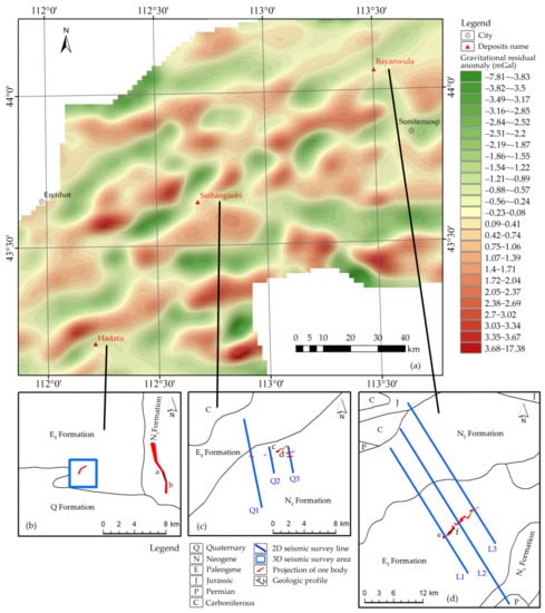 (a) Map of gravitational residual anomalies and the deposits’ positions in the study area. (b) The area of 3D seismic surveys performed in the Hadatu deposit. (c) The lines of the 2D seismic survey performed on the Saihangaobi deposit, and (d) the lines of the 2D seismic survey performed on the Bayanwula deposit.