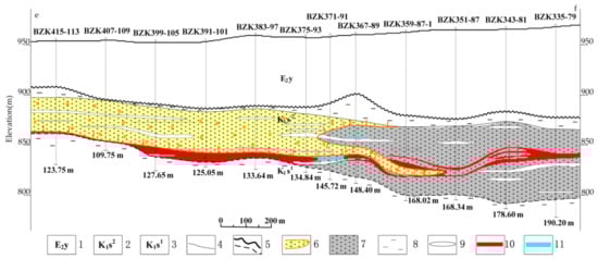Geological profile of e–f in the Bayanwula uranium deposit. 1—Yierdingmanha group. 2—Upper part of Saihan group. 3—Bottom part of Saihan group. 4—Lithologic boundary. 5— Angle or parallel unconformity boundary. 6—Yellow oxidized sands. 7—Gray reducing sands. 8—Impermeable mudstone. 9—Local impermeable layers. 10—Uranium ore bodies. 11—Uranium mineralization.