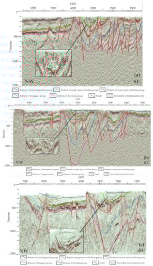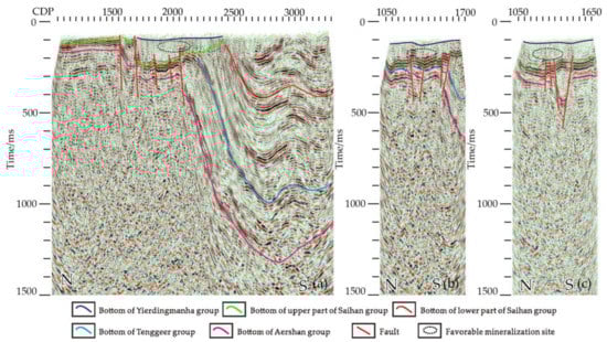 The seismic survey results on Saihangaobi uranium deposits; Q1 (a), Q2 (b), Q3 (c).