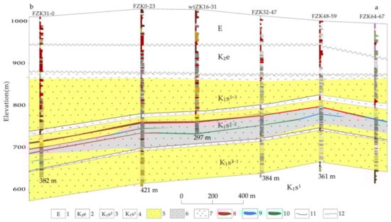 The Saihangaobi SUD is located approximately 50 km southwest of the Bayanwula deposits. It is a paleo-valley-type uranium deposit, featuring significant differences in terms of the phreatic oxidation from roll-front oxidizing deposits. Phreatic oxidation contributes to the presence of tabular ore bodies (Figure 8) similar to those of the Russian Trans-Ural [59] and Colorado [60]; the depth of this type of oxidation varies according to the rock’s permeability and the presence of fissures but is generally dozens of meters. The U mineralization containing carbon matter is also hosted within the glutenite braided fluvial deposits in the upper section of K1s FM, and the top and bottom formations of the target sand layers are dominated by mudstone.