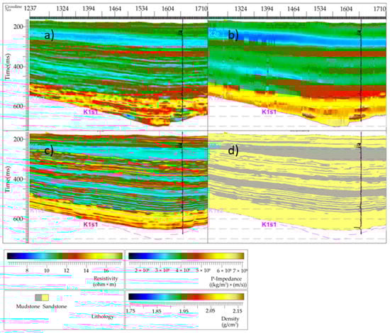 The typical inversion profile extracted from the 3D dataset, ranging from K2e to K1s1, is shown in Figure 11. The p-wave impedance (a) and density (b) were calculated by pre-stack inversion; the resistivity (c) was inverted from the post-stack logging inversion based on seismic constraints, and the (d) lithology was calculated from the resistivity. In this picture, the inserted black lines show the gamma logging curve, and we know that most of the gamma data are located in the area with high resistivity, high impedance, and high density, as well as in the sand bodies.
