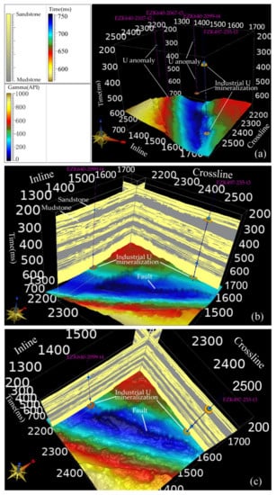 It is worth mentioning that no industrial U mineralization has been found in the positions of EZK640-2067-t3 and EZK640-2107-t2, although there is a U-shaped “big depression” under the target layer, and there are sand bodies in the target formation. Figure 10 shows that there are no faults that connect the deep and shallow formations under the area in which two boreholes appear, and faults may strongly determine uranium mineralization. In Figure 13, there are two layers of U mineralization in FZK495-255-t3 and EZK640-2099-t4; the shallow ones are medium-grade uranium mineralizations with an average gamma value of about 250 API at 530 ms and 500 ms, respectively, and the deep ones have the highest gamma values of about 1271 and 2467 API, respectively, which are far beyond the standard industrial grades of 680 ms in the FZK495-255-t3 and 600 ms in the EZK640-2099-t4.