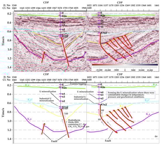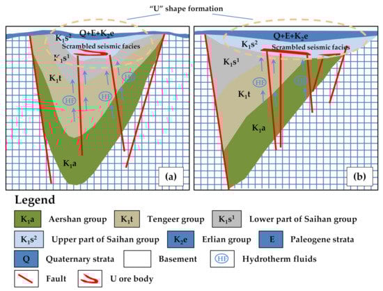 Additionally, the logging data of the Hadatu deposits show that the deepest industrial uranium mineralization is about 650 m down (shown in Figure 3). It was very difficult to mineralize at such depths in previous SUDs studies; the phenomenon whereby high-grade U mineralization occurs at great depth cannot be easily clarified by traditional roll-front metallogenic mechanisms in the Erlian basin. In order to explain this occurrence, we here propose the hypothesis of “hydrothermal effusion” mineralization over conventional mineralization, mainly inspired by seismic interpretation; meanwhile, some mineralogical evidence suggests the participation of hydrothermal fluids [49]. As such, we assume the mineralization process may occur as follows (shown in Figure 13): thick reducing strata were deposited in the K1t and K1a periods, and U preconcentration occurred in the reducing formation. The target sandstone was deposited in the Cretaceous Saihan period. Afterwards, as a result of Earth’s dynamics, an upward migration of hydrothermal fluids occurred, as the hydrothermal fluids originating from the reducing formation (K1t and K1a) migrated upward along the faults or fraction zone into the shallow target sand. In the preprocess, the fluids carried a certain amount of U4+, H2, CO2, and other reducing materials (e.g., oil, gas, CH4, H2S). When the hydrothermal fluids flowed through the reducing formations, they carried some reductive materials out with them; this led to the further enrichment of the reducing agent in the fluids. Consequently, U-bearing and highly reductive fluids moved into the shallow target sandstone, and then physicochemical reactions took place. Physically, the uranium in the fluids may have been liberated due to the drop in temperature and pressure; chemically, the U may have been precipitated owing to a redox reaction occurring when the fluids encountered the oxidized sand of the target formation. At the time the SUD formed, the grade of the ore deposits would have been high, given the superposition of the newly formed U mineralization and the pre-enriched U.