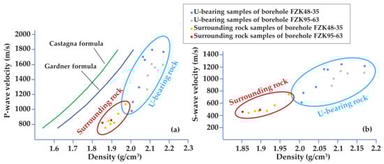 Experimental results of petrophysical parameters for uranium-bearing rock and the surrounding rock in the Hadatu deposits. (a) p-wave and density; (b) s-wave and density.