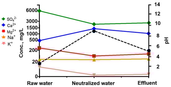 The water quality results showed that the pH of the raw water was 2.8, and then it increased to 8.37 in the neutralization reactor and then subsequently decreased to 5.57 at the final effluent point (Figure 2). The decrease in pH of neutralized water in the sediment basin could decrease due to hydrogen ion release from CaCO3(s) formation induced by CO2 dissolution, in accordance with Equation (5),