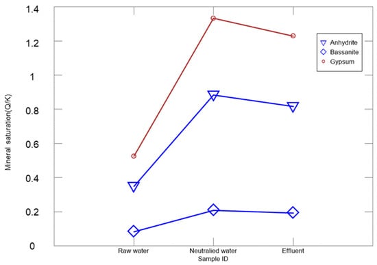The K+ component concentration was 13 mg/L in raw water and 3 mg/L at the final effluent point. The Na+ component showed almost no concentration change. The sulfate ion concentration was 5870 mg/L in the raw water, but it decreased to 2560 mg/L at the final effluent point, because the SO42− component reacted with the Ca2+ component to produce Ca sulfate minerals [23,24]. (Equation (3)). As the AMD was neutralized, the concentrations of Ca2+ and SO42− increased and decreased, respectively. The water quality data shown in Figure 2 were thus used to calculate the SI of the minerals in the hydrated lime neutralization process, with a particular focus on those related to the SO42− ions (Figure 3).