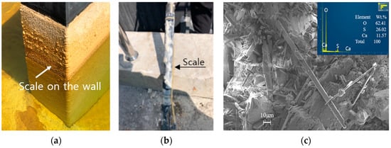 Scale was observed on the pH electrodes at the effluent point and on the concrete walls of the onsite sedimentation basins that were in contact with the neutralized water (Figure 4a,b). An SEM image of the scale on the pH meter showed the presence of gypsum with a rod shape and the following composition: O (62.41 wt.%), S (26.02 wt.%), and Ca (11.57 wt.%) (Figure 4c)). The XRD analysis of the same sample also identified the dominant formation of gypsum [25]. Gypsum is well known as a scale-causing substance, and its production is difficult to suppress, even when the pH is adjusted [23,26]. Gypsum scale was observed throughout the whole sedimentation basin (including the final effluent point) during the onsite survey. However, Fe and Al hydroxide sediments were discovered around the front of the basin (Figure 4a,b)). These phenomena could result from a difference in the rate of precipitation between Ca2+ ions and Fe/Al3+ ions under alkaline conditions. In other words, Fe and Al3+ would precipitate quickly as hydroxide forms after neutralization. Subsequently, the solids might pile up from the floor at the front of the sedimentation basin, which is evidence of the relatively rapid precipitation of Fe and Al3+ under the present conditions. However, Ca2+-derived gypsum settled throughout the entire sedimentation basin when neutralized water continuously flowed into the basin, and scale developed on the walls and on the surface of the pH electrodes. This gap in the precipitation rate was also confirmed when the AMD was neutralized in a lab-scale experiment: the Fe and Al hydroxides settled on the floor of the beaker within 1 h, but gypsum was formed slowly over 24 h. As a result, it is estimated that the precipitation rate of dissolved ions is a key factor determining the dispersion degree of precipitates in the neutralization process.