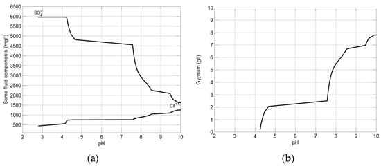 Simulation results for the (a) Ca2+ and SO42− concentrations and (b) the amount of gypsum with an increasing pH.