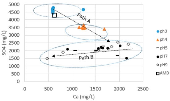 Figure 6 shows the concentration levels of Ca2+/SO42− classified by each pH group obtained from the neutralization experiments. The data for Ca2+ and SO42− were relatively clumped together at pH 3 and pH 4, but they were scattered widely at pH 5, pH 7, and pH 9, showing that the concentrations differed according to the pH value. Path A in Figure 6 shows that as the pH increased, the concentration of Ca2+ increased, while that of SO42− decreased. When neutralization of the AMD was increased to pH 5, differences in concentrations occurred over time, as shown by Path B. While the sulfate concentration was maintained at 2000 ± 500 mg/L, which is the equilibrium concentration level for gypsum, the Ca2+ component decreased (Figure 6). Gypsum was produced for 24 h, and changes in the concentrations of Ca2+ and SO42− were observed over 24 h [27]. The evolutionary processes of the minerals within the water are shown in Figure 6, where it is evident that the water was initially oversaturated with gypsum, but it then became saturated over time. However, this event was not confirmed in the simulation results [28].