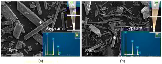 When the mine drainage was neutralized in a laboratory, a white substance was continuously produced in the overlying water over 24 h. The precipitates collected at pH 5 and pH 9 were analyzed using SEM/EDS, and the results confirmed that they had long shapes (a typical characteristic of gypsum) and that the main components were O, S, and Ca (Figure 7). A small amount of gypsum was observed when the pH of the AMD was 3, although it was difficult to distinguish the particles of gypsum, because tiny iron flocs were highly suspended. However, at pH levels of 4 and higher, the precipitation of gypsum in the Imhoff cone could be observed with the naked eye. The volume of gypsum was measured at pH 5 and 9, respectively, and the results showed that the amount of gypsum in 1 L (volume) of neutralized water corresponded to 2.2% and 3% (Figure 7) of the total contents and weighed 1.4 g and 3.0 g, respectively. After neutralization for 24 h, the gypsum incorporated into the metal sludge and the gypsum attached to the inner wall of the Imhoff cone could not be considered in the measurements; however, the actual amount of gypsum produced was greater than the amount measured. The simulation results (shown in Figure 5b) predicted that gypsum amounts of approximately 2 g/L and 7 g/L would be produced at pH 5 and 9, respectively. Therefore, both the neutralization experiment and the simulation showed identical results: gypsum was produced in the early stage of neutralization, and its volume increased as the pH increased.