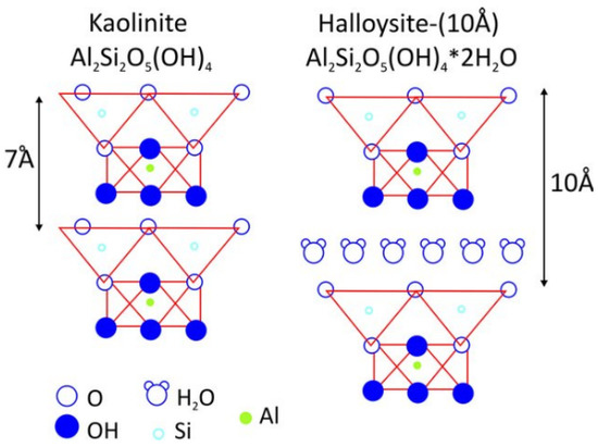 Kaolin mineral structure, which contains kaolinite, dickite, nacrite, and halloysite minerals, is formed by the repetition of a tetrahedral layer and an octahedral layer. The oxygen at all ends of silica tetrahedrons is in the same direction, so that the oxygen and/or hydroxyls, which may be present to balance loads, are shared by silicones in the tetrahedral layer and aluminum in the octahedral layer. While kaolinite mineral has the chemical formula of Si4Al4O10(OH)8, whose unit structure of Si4O6 comes from the silica tetrahedron layer and the unit structure of Al4O4(OH)8 comes from the alumina octahedron layer [1,2], the ideal formula for halloysite is Si2Al2O5(OH)4.nH2O, and the mineral is named 7Å and 10Å in the literature, depending on the n molecule water [3,4,5]. The n value is 0 for 7Å halloysite, and it reaches 2 in 10Å halloysite [6]. Therefore, chemical analysis of halloysite mineral with 7Å basal layer is the same as kaolinite mineral, however, halloysite 10Å mineral contains 2 moles more water [7,8]. As the molecular water content of the halloysite mineral increases, the basal opening between layers is enlarged (Figure 1).