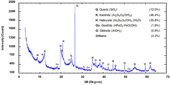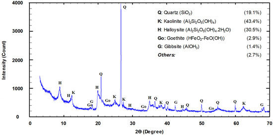 Additionally, the mineralogical analysis of the sample shown in Figure 2 indicated that the sample contained 43.4% kaolinite and 30.5% halloysite, along with gangue minerals of 19.1% quartz and 2.9% goethite.
