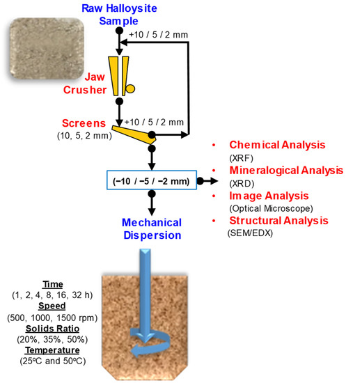 Within the scope of halloysite dispersion studies with mechanical force, the halloysite ore feed size (−10, −5, −2 mm), blunging speed (500, 1000, 1500 rpm), and time (0, 1, 2, 4, 8, 16, 32 h), aging (1, 2, 4 days), pulp concentration (20%, 35%, 50%), and pulp temperature (25 °C and 50 °C) parameters were investigated in terms of particle size distribution and chemical composition of the resulting products.