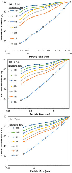 The success of the process was evaluated based on the amount of −38 µm size fraction of blunged materials (Figure 5). As seen in Figure 5, the amount of −38 µm material increased with the increase in blunging time. On the other hand, the amount of −38 µm material increased with the coarser feeding size for the same blunging period. Thus, it was determined that the clay minerals, which are plastic, passed to the finer size more quickly with mechanical dispersion that was made in the feed size of −10 mm. In addition, at the end of the 8 h of blunging time, the material amounts of −38 μm size for −10 mm, −5 mm, and −2 mm feed sizes were determined as 72.3%, 70.7%, and 66.3%, respectively (Figure 5).