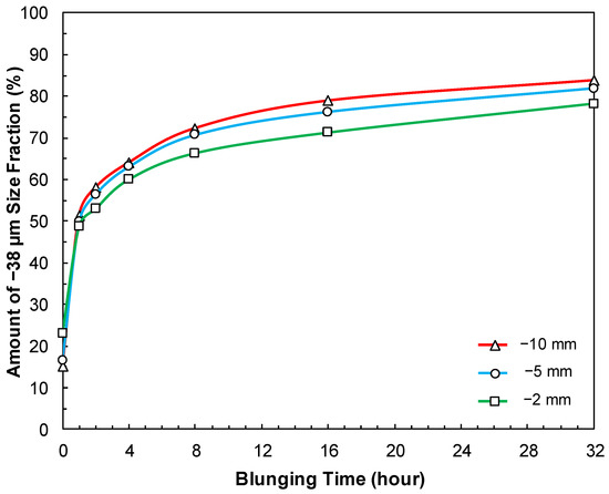 The amount of −38 µm size fraction products according to feed size and blunging time (1000 rpm blunging speed and 35% pulp concentration at room temperature, 25 °C, no aging).