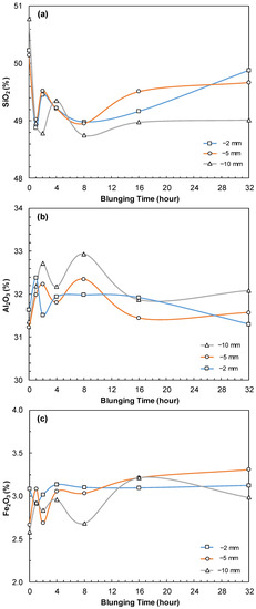 (a) SiO2, (b) Al2O3, and (c) Fe2O3 contents of −38 μm size fraction as a function of blunging time (1000 rpm blunging speed and 35% pulp concentration at room temperature, 25 °C, no aging).
