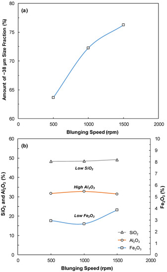 The blunging speed was changed to 500 rpm, 1000 rpm, and 1500 rpm, while the other parameters were arranged and kept constant at −10 mm of feed size, 8 h of blunging time, and 35% pulp concentration. The effect of blunging speed on dispersion was examined in terms of the amount and chemical analysis of the −38 μm size fraction of the products (Figure 7).