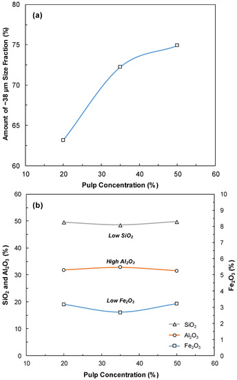 (a) The amount and (b) Al2O3, SiO2, and Fe2O3 contents of −38 µm size fraction as a function of pulp concentration (Feed size −10 mm, blunging speed 1000 rpm, at room temperature 25 °C, no aging).