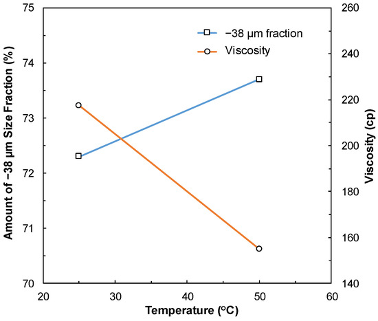 In industrial practice, the flow resistance or viscosity of the pulp is reduced with high temperature, allowing it to reach increased capacities in the preparation process, while the amount of unit energy required for blunging the product decreases. In order to test the effect of the pulp temperature on blunging, which is defined as the amount of −38 μm sized material, some blunging tests in different pulp temperatures were carried out. The pulp temperature was increased to 50 °C from room temperature of 25 °C and the other parameters such as feed size (−10 mm), blunging time (at 1000 rpm), and the pulp concentrations (at 35%), were kept constant. The change in particle size is illustrated in Figure 9. When the pulp temperature increased from 25 °C to 50 °C, no significant difference was observed in the amount of −38 µm sized material.