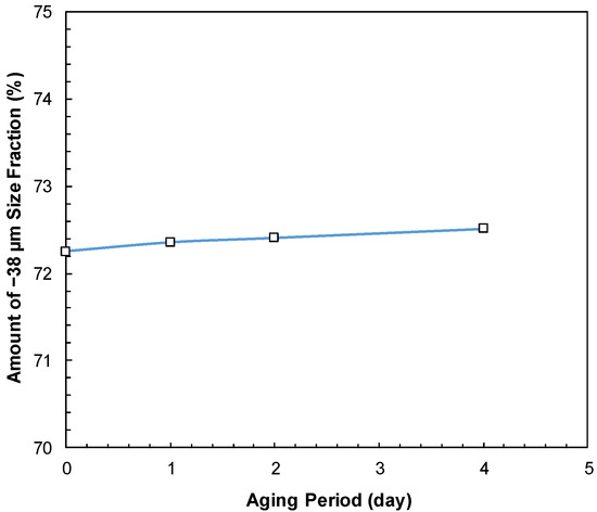 Change in material amounts of −38 μm sized material depending as a function of aging time (Feed size −10 mm, 35% pulp concentration, blunging speed 1000 rpm, at room temperature 25 °C).