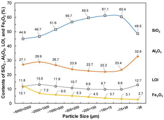 The change of SiO2, Al2O3, LOI, and Fe2O3 contents of particle size groups in optimum mechanical dispersion conditions (Feed size −10 mm, 35% pulp concentration, blunging speed 1000 rpm, at room temperature 25 °C, no aging).