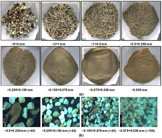 (a) Photographs of products as a function of particle size (b) Optical microscope images of the products at low particle sizes under optimum conditions (Feed size −10 mm, 35% pulp concentration, blunging speed 1000 rpm, at room temperature 25 °C, no aging).