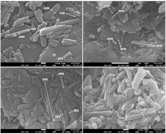 The optical images of −38 µm-sized materials could not be taken due to the difficulty encountered in the homogenous spreading of the agglomerated and very fine particles in this fraction, therefore SEM images were taken to characterize the type of clay minerals, tubular halloysite, and layered kaolinite structures were confirmed by SEM imaging. From the SEM images, it was measured that the widths of the tubes range between 78–150 nm and the lengths between 280–919 nm. It was also seen that the tubular halloysite minerals were agglomerated (Figure 13).