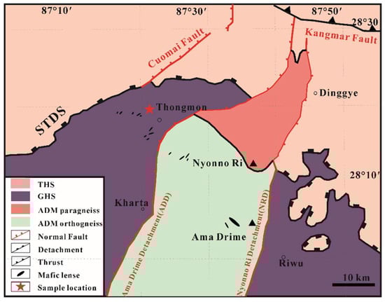 Simplified geological map of Ama Drime massif with sample location marked by a red star (modified after Li et al. (2019) []). Abbreviations are as in Figure 1.