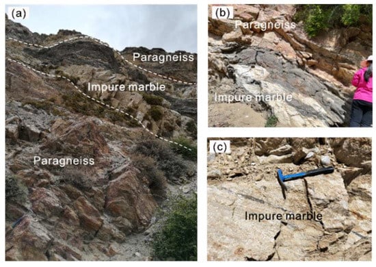 Outcrops of impure marble and surrounding paragneiss in the Thongmön area. (a,b) Impure marble lenses occur within the paragneiss; (c) impure marble with preserved sedimentary beddings and darker silicate impurities.