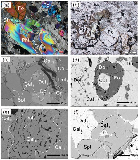 (a) Phlogopite inclusion in spinel; (b) forsterite contains a Mg-calcite inclusion (CalI); (c) relatively homogeneous dolomite (DolII) exsolved from Mg-calcite in the matrix, and the domains adjacent to dolomite (DolII) become Mg-poor calcite (CalII); (d) irregular oval- and rod-shaped calcite inclusions with lower aspect ratios in forsterite; (e) spinel with Mg-calcite (CalI) inclusion is replaced by a very fine-grained aggregate of Mg-, Al-rich hydroxides during a late stage of metamorphic history; (f) partly serpentinized forsterite contains Mg-calcite with lower aspect ratios and Mg-calcite + dolomite polyphase inclusions.