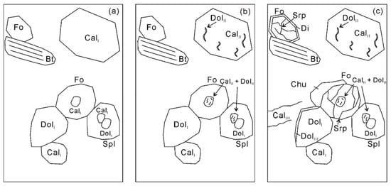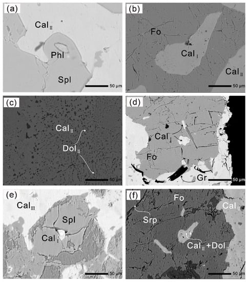 Dolomite (Dol) occurs both as exsolutions (Figure 4d) and polyphase inclusions together with calcite (Figure 4c) in forsterite and spinel. Vermicular or wormy dolomite lamellae and coarser dolomite exsolutions were also commonly found in the matrix calcite. In some cases, the matrix dolomite is crosscut by the veinlets of Mg-poor calcite or almost pure calcite along the cracks and grain margins (Figure 4c). The irregular contact boundaries between calcite and dolomite indicate a reaction relationship (see Section 6.1). (Mg-)calcite + dolomite polyphase inclusions in spinel and forsterite suggest the preliminary existence of aragonite during prograde metamorphism [,].