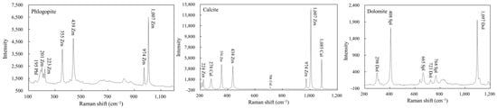 Micro-Raman spectra of calcite and phlogopite inclusions in zircon, and dolomite inclusion in spinel.