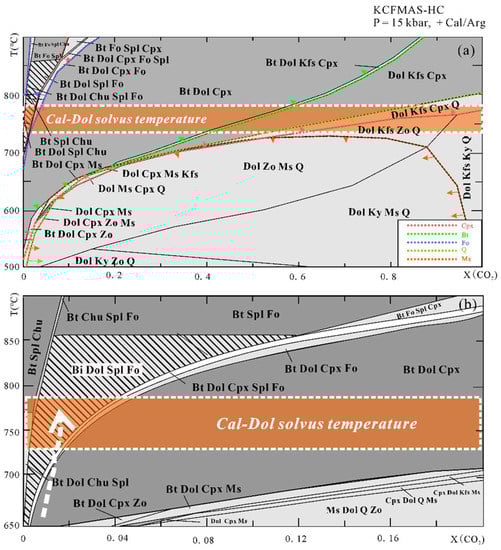 (a) T-X(CO2) pseudosections at 15 kbar (X(CO2) = 0–1) for the Thongmön impure marble in the system CKFMAS-HC (the modeling oxide compositions are as follows: SiO2 = 11.74, MgO = 21.42, Al2O3 = 1.29, CaO = 31.79, FeO = 0.36, K2O = 0.15 from the XRF analysis, in wt%). Light- and dark-grey fields are tri- and quadri-variant fields, respectively. Different color dashed lines with arrows are phase-in boundaries. The mineral assemblages in the shaded field are predicted by the T-X(CO2) pseudosection and also observed as inclusions in the metamorphic zircons. White dashed lines with orange filled band represent the range of peak temperature at 15 kbar evaluated by the calcite-dolomite solvus thermometer from Anovitz and Essene (1987) [] and Hermann et al. (2016) []; (b) the same T–X(CO2) pseudosection as (a) but with a narrower fluid range from pure H2O to X(CO2) =0.2. The white dashed arrow points to the internally buffered T–X(CO2) path compatible with both the observed peak assemblage and the corresponding decarbonation Reactions (2)–(4). See more details in the text.