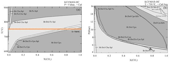 (a) T-X(CO2) pseudosection at 5 kbar and (b) P-X(CO2) pseudosection at 750 °C. The thick dashed line indicates a possible P–X(CO2) path showing the fluid evolution during isothermal exhumation.