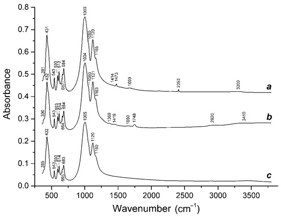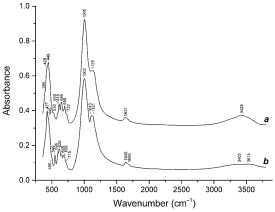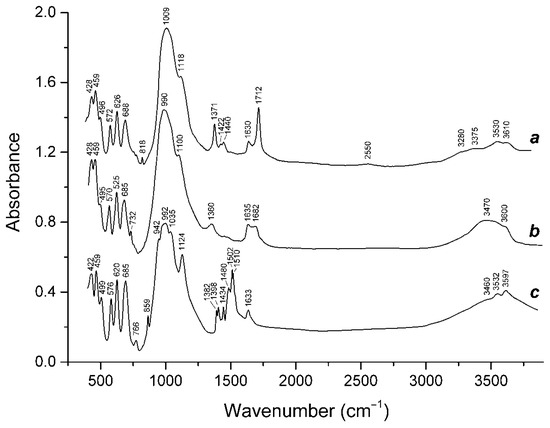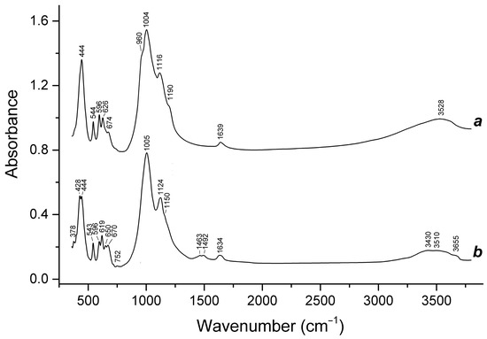 In order to obtain IR absorption spectra, powdered Samples 1–15 were mixed with anhydrous KBr (in the KBr: mineral ratio of about 150: 1), pelletized and analyzed using an ALPHA FTIR spectrometer (Bruker Optics, Ettlingen, Germany) at a resolution of 4 cm−1. A total of 16 scans were collected for each spectrum. The IR spectrum of an analogous pellet of pure KBr was used as a reference.