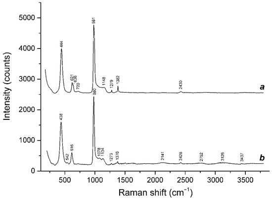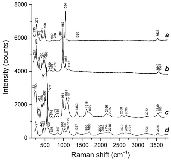 The Raman spectra of both aforementioned kyanoxalite samples (Samples 5 and 6, curves c and d, respectively, Figure 2) contain bands of oxalate anions (in the ranges of 780–850, 1350–1360 and 1600–1700 cm−1, which correspond to the bending, symmetric stretching and antisymmetric stretching vibrations of carboxyl or carboxylate groups). The strongest band of carbonate groups (symmetric C–O stretching mode, the range 1050–1060 cm−1: see curves a and b in Figure 2) is not observed (for Sample 5) or it is very weak (for Sample 6). The strongest band of admixed sulfate groups (symmetric S–O stretching mode, the typical range 970–1000 cm−1: see curve b in Figure 2) is located at 981 and 976 cm−1 in the Raman spectra of Sample 5 and Sample 6, respectively. The Raman bands of the two-layer, cancrinite-group minerals observed in the range of 3500–3600 cm−1 correspond to the stretching vibrations of water molecules.