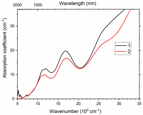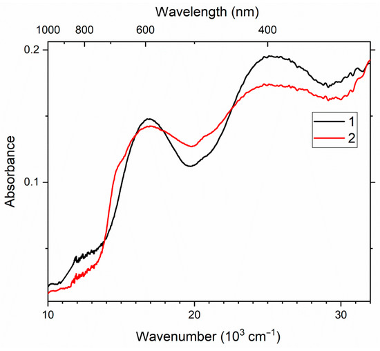 UV–Vis–near IR absorption spectra of afghanite Samples 9 (curve 1) and 10 (curve 2).