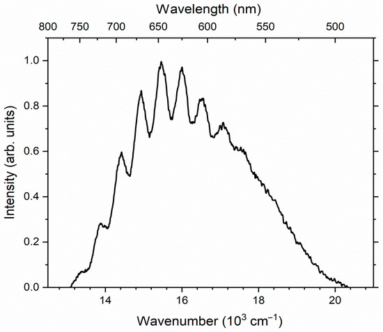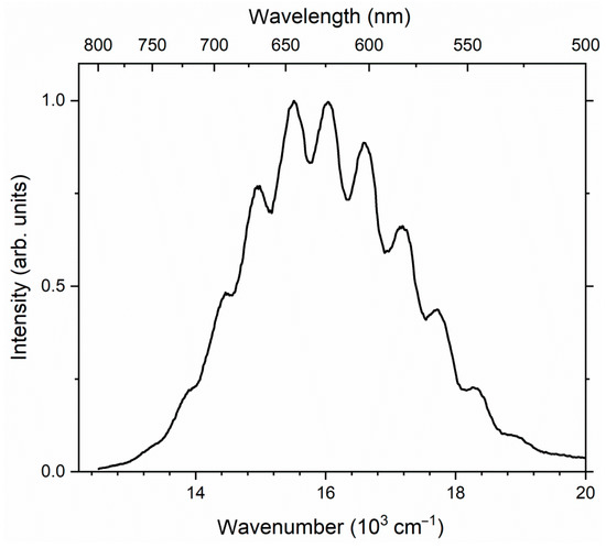 The UV–Vis–near IR absorption spectrum of kyanoxalite from Flora (Sample 6) is given in Figure 3. This spectrum shows a broad band with a maximum of about 16,900 cm−1, as well as a broad band at 25,400 cm−1. Luminescence was recorded under excitation in this band. In this case, a wide band with a pronounced vibrational structure is observed with maxima at 12,595, 13,294, 13,873, 14,428, 14,914, 15,477, 16,040, 16,603, 17,199, 17,729 and 18,294 cm−1 (Figure 4).
