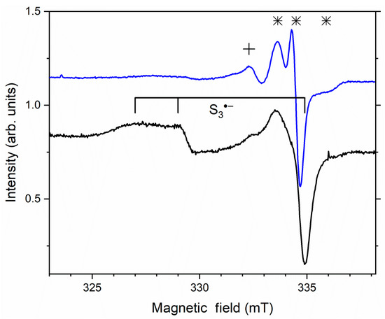 In the region of about 40,000 cm−1 is the ionization energy of CO32− anions, which are electron donors. A simultaneous increase in the number of CO3•− centers and a decrease in S3•− upon irradiation may indicate that there is a photoinduced electron transfer from CO32− to S3•− with the formation of S32− anions, the absorption of which is in the vacuum ultraviolet region, and they did not appear in the ESR spectra obtained in this work.