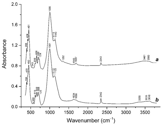 Infrared spectra of two nosean samples originating from different geological environments are shown in Figure 6 (Samples 7 and 8; curves a and b, respectively). They contained bands of O–H stretching vibrations of H2O molecules (in the range of 3480–3620 cm−1), antisymmetric stretching vibrations of CO2 molecules (at 2342 and 2343 cm−1) and asymmetric stretching (1133–1140 cm−1) and bending (618–619 cm−1) vibrations of SO42− anions, as well as different modes of the aluminosilicate framework (other bands in the range of 360–1200 cm−1). Additional bands at 1352, 1687–1690 and 3355 cm−1 are related to acid groups.