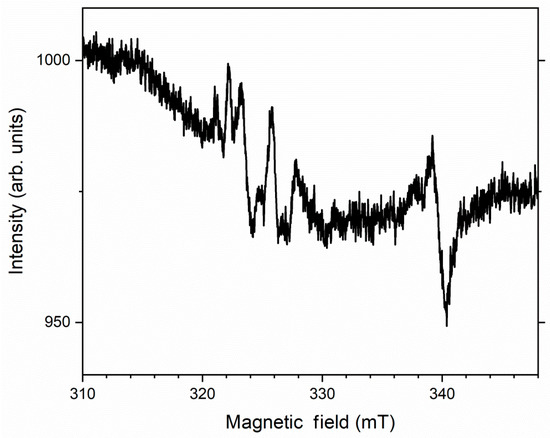 The ESR signal of the second type of center can be associated with the presence of radical anions CO2•− or HC2O4•− in kyanoxalite. For CO2•− centers in strontium carbonate, the components of the g tensor are g1 = 2.007, g2 = 2.005 and g3 = 1.998 [30]. Corresponding values for HC2O4•− in ammonium oxalate monohydrate are g1 = 1.999, g2 = 2.002 and g3 = 2.005 [31]. The averaged g factor for oxalate radical anions in aluminosilicates is about 2.004 [32].