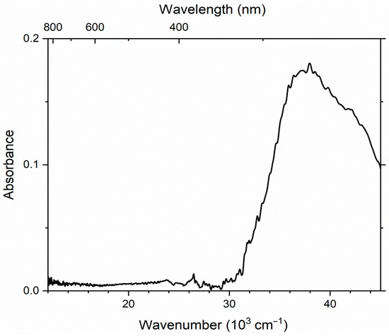 In the ESR spectrum of Sample 7, a weak signal with g = 2.018, related to a sulfide radical anion, is observed on the background of a broad signal from Fe3+ clusters which presumably occurred in admixed iron oxide (Figure 9). A similar signal was assigned to the S6•− radical anion [21]. In the UV–Vis–near IR absorption spectrum (Figure 10), Sample 7 showed a broad peak at 37,600 cm−1, which is close to the band at 37,700 cm−1 assigned to the S6•− radical anion [19].