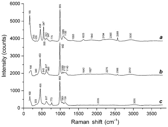 Raman spectra of the afghanite Samples 10 (a), 9 (b) and 11 (c).