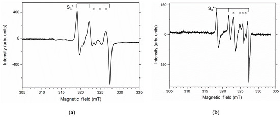 In addition to the signal from S3•−, in the ESR spectra of the studied afghanites, one more signal is observed, with g factors of 2.030, 2.018, 2.011 and 2.007. The corresponding peaks are marked in Figure 14 with asterisks. This signal could have been caused by radiation-induced radical anions (SO3)•− or (SO4)•− [38,39]. A signal with g = 2.008 was previously observed for minerals of the sodalite group [5] and sapozhnikovite [7]. In [40], this signal was attributed to the S2•− radical anions. However, in the ESR spectra of alkali halide crystals and synthetic ultramarine, the g tensor has a significant anisotropy (g1 = 2.69, g2 = 2.03 and g3 = 1.86) [41].