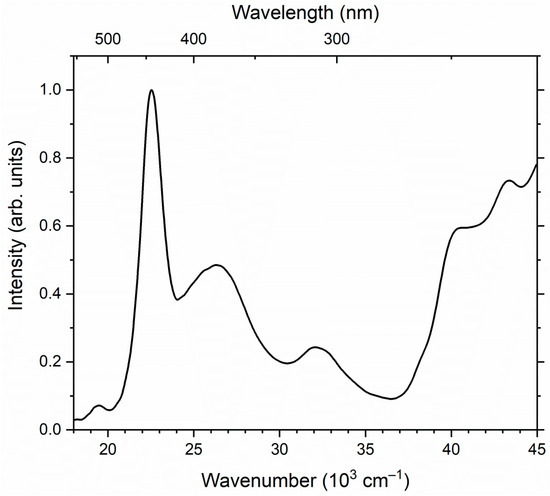 The luminescence excitation spectrum of Sample 9 is shown in Figure 16. In this spectrum, intense bands with maxima at 22,500, 26,500 and 32,300 cm−1, as well as a rise starting at about 37,000 cm−1, are observed.