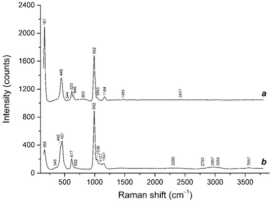 - Chukanov, N.V.; Vigasina, M.F. Vibrational (Infrared and Raman) Spectra of Minerals and Related Compounds; Springer: Dordrecht, The Netherlands, 2020; 1376p. [Google Scholar] [CrossRef]